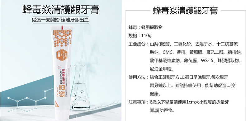 蜂毒牙膏具有顯著的消炎殺菌的功效,其實有很多朋友可能都會有牙齦腫痛紅腫的狀況,蜂毒牙膏添加了蜂毒提取液,可以起到消炎殺菌的功效,拒絕口腔中產生太多的細菌,囙此可以消除口腔中的异味,能够讓口氣變得清新起來,讓交流變得順暢起來。